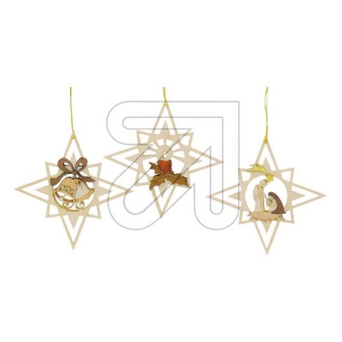 Holz-Handarbeit natur, mit Aufhängkordel, 6 Sterne mit 3 verschiedene Weihnachtsmotive im Beutel