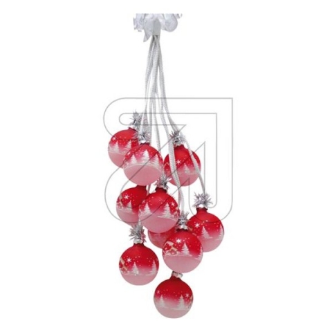 Glaskugelgehänge hängend, mit 10 beleuchteten Echtglaskugeln Ø 8cm mit Motiv Winterlandschaft, Dekoschleife und Stoffband weiß, 1 Ersatz-Kugel, Minilichterkette, Zuleitung weiß 3,4 m und Fenster-Klemmhalterung