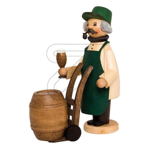 Holz-Handarbeit, stehend mit Bierglas, Sackkarre und Bierfaß
